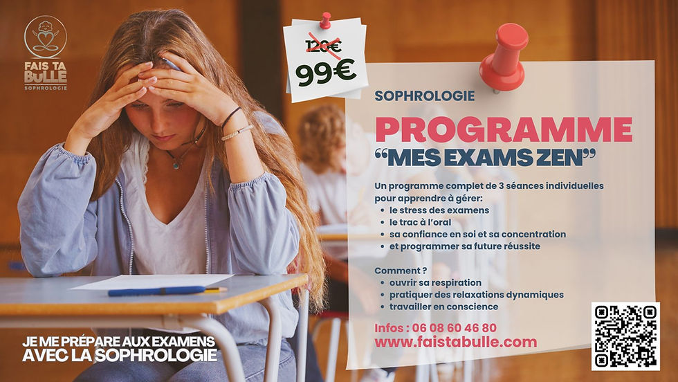 Pour éviter de perdre tous ses moyens le jour de l’épreuve, ou pour préparer un passage à l'oral, une préparation avec la sophrologie est une manière simple et originale de réussir dans les meilleures conditions.